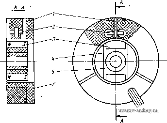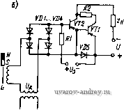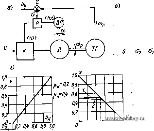 Рис. 6-14. Зависимости управляющих импульсов и тока в обмотках двигателя от времени На рис. 6-13, б изображен второй метод управления, при котором воздействие на коммутатор К осуществляется по слаботочной цепи обратной связи. Усилитель У, включенный в эту цепь, управляет сигналом малой мощности и поэтому может быть выполнен на значительно меньшую установленную мощность, чем на схеме рис. 6-13, а. Схема рис. 6-13, б оказывается особенно простой при релейных и импульсных способах управления двигателем, при которых отключение цепи обратной связи приводит к торможению двигателя, а включение цепи - к его разгону. Рассмотрим характеристики, получаемые, при некоторых способах импульсного и релейного управления скоростью. Пусть управляющая функция / {Uy) представляет собой импульсную функцию с периодом Ту (рис. 6-14). Длительность импульса в зависимости от управляющего сигнала может быть записана в виде соотношения = kUy, причем О < у < Гу. Ток, протекающий по обмотке двигателя, в результате воздействия импульсной функции на коммутатор К по каналу обратной связи (см. рис. 6-13, б) будет представлять собой последовательность импульсов того же периода Ту. Поскольку частота 1/Гу импульсной функции может быть достаточно высокой, фронт импульсов тока двигателя не будет крутым, так как будет сказываться влияние индуктивности обмотки двигателя. В зависимости от высоты импульсов тока и их длительности будет изменяться среднее значение электромагнитного момента и вид механической характеристики. На рис. 6-15 приведены примерные кривые механических и регулировочных Характеристик бесконтактного двигателя в относительных единицах. Здесь v&p/apo, l. = MJM ср, у = - ty/Ty. Регулировочные характеристики двигателя, как правило, нелинейны. Нелинейность характеристик особенно заметна при малых моментах нагрузки (ц.н<0,2). Здесь незначительное приращение сигнала может привести к резкому изменению угловой скорости, что затрудняет глубокое и устойчивое регулирование скорости двигателя. Практически данный способ импульсного регу- 7,0 0,8 0,6 О 0,2 д4 0,6 0,8 1,0 ![]() 0,2 /7, 0,6 0,8 1,0 Рис. 6-15. Механические и регулировочные характеристики двигателя лнрования не позволяет обеспечить кратность изменения скорости 1520. Значительно большими возможностями обладает релейно-им-пульсное регулирование с обратной связью по угловой скорости. На рис. 6-16, а изображена структурная схема такого регулирования. Двигатель Д имеет измерительный тахометрический узел в виде встроенного тахогенератора ТГ. В качестве сигнала тахогенератора в некоторых случаях может &лть использована ЭДС пассивных секций обмотки, пропорциональная скорости юр. Сигнал тахогенератора поступает на узел сравнения (сумматор) J), где сравнивается с сигналом управления (7у. Разность этих сигналов поступает на релейный полупроводниковый усилитель Р, включен-ный-в цепь датчика положения ДЯ. Если релейный усилитель имеет характеристику, показанную на рис. 6-16, б, то срабатывание реле, приводящее к включению двигателя, происходит при сигнале Oi, а отпускание реле, соответствующее отключению двигателя, при сигнале о%. Таким образом, реле имеет гистерезис -©2 и зону нечувствительности о^. В результате в установившемся режиме при подаче на вход системы сигнала управления {/у скорость двигателя совершает колебания между двумя крайними порого- выми зн