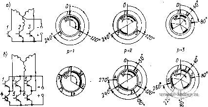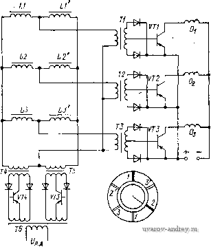 Главная страница » Электрика в театре » Коэффициент форсировки систем 1 ... 5 6 7 8 9 10 11 ... 18 Угол ао выбирается так, чтобы в начале и в конце межкоммутационного интервала были равны ЭДС (0) = Е^ (ак); учитывая, что к = л/3, находим, cos ( о-я/3) = cos ао; отсюда ао = я/6 и -СФ(0рСО5(а--); аналогично Mi2 = (6-5) (6-6) ![]() ![]() унт Рис. 6-11. Принципиальная электрическая схема статора трехсекциониого двигателя с реверсивным питанием (а); схемы замещения (б и в) При соединении секций звездой при нереверсивном питании (см. рис. 6-7) в образовании момента всегда участвует только одна секция. В этом случае ак = 2я/3 и ао = я/6; поэтому £i = CO<OpCos(a-л/3); Mi = CO/iCos(a-n/3) I при о < а < 2л/3. Для простейшего односекционного двигателя ак = л и ао = 0; при этом из формул (6-3) получаем £i = COft)pCos(a-л/2); М1 = СФ/1С08(а-л/2) } при о а < л. Из приведенных выражений для момента следует, что он зависит от тока, потребляемого двигателем. В свою очередь, этот ток может быть найден, если известны токи отдельных секций двигателя на межкоммутационном интервале ак. Рассмотрим метод нахождения токов двигателя на примере трехсекциониого двигателя с реверсивным питанием и соединением секций звездой. На рис. 6-П,а представлена принципиальная электрическая схема такого двигателя, которая отличается от аналогичной упрощенной схемы (см. рис. 6-8) наличием диодов, необходимых для снятия перенапряжений с переключающих силовых тран- Зйсторов коммутатора в момент отключения секций и для создания условий использования электромагнитной энергии, накопленной к моменту очередной коммутации в отключаемой секции. Поскольку в установившемся режиме работы все процессы в двигателе являются периодическими, с периодом, равным межкоммутационному интервалу ак (в данном случае ак = л/3), достаточно определить токи и моменты двигателя в пределах только одного интервала поворота ротора ак. Свяжем начало этого интервала с положением, которое занимает ротор на рис. 6-8, когда указанный на рисунке сектор датчика положения ДЯ выходит из взаимодействия с чувствительным элементом 3, транзистор VT3 запирается и секция 3 обмотки отключается. Одновременно появляется сигнал на элементе 1, отпирается транзистор VT1, и секция 1 подключается к источнику питания. Транзистор VT2 на протяжении всего интервала О < а < л/3 остается открытым, поскольку элемент 2 датчика положения находится в зоне указанного сектора ДЯ. После отключения секции 3 в схеме на рис. 6-П, б благодаря диоду VD3 создается контур для протекания тока, состоящий из секций 3 и 2, открытого транзистора VT2 и открытого диода VD3. В таком замкнутом контуре исключается скачок тока в секции 3- в момент ее отключения от источника, а значит, и перенапряжение на транзисторе VT3, обусловленное ЭДС самоиндукции Ldljdt, которое при отсутствии диода VD3 теоретически может достигать бесконечного значения (мгновенный разрыв цепи с током /3). Практически это перенапряжение может оказаться достаточным для пробоя транзистора VT3 и выхода его из строя. Второй контур на рассматриваемом интервале угла поворота ротора образуется из подключенной секции /, секции 2, открытых транзисторов VT1 и VT2 и источника питания , с напряжением U. Схема замещения двигателя, содержащая два названных контура, представлена на рис.6-П, б. Ток /3, замыкаясь по первому контуру (секции 3, 2, транзистор VT2, диод VD3), спадает до нуля. Этот процесс занимает время, соответствующее 