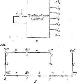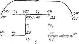 Аналоговый мультиплексор Преобразователь то лаг-под ПОСЛЕД. ОПРРС/ФИК-СЛЦМЯ КАНАЛА ![]() НОМЕР КАНАЛА ИЛИ ЧИСЛО КАНАЛОВ ЗАПУСК ПРЕОБРАЗОВАНИЕ ПРЕОВ- БЫПОЛНЕНй РАЗОВА-ТЕЛЯ Пуск 100 рд OOf ОВсчетчике 011 Продолж. 01О -о -р --о ОСТАТ. СНЕТЧ. Режим Z О в счетчике ПреобразоВо-111 пае выполнено послед. опрос, данные каналов, режим равоты фикс. канала запьск преобр. Продолж. режим 1 т Рис. у.5.6. Асинхронная система сбора информации. а - упрощенная блок-схема системы; б - граф переходов. Щек-команда поступает от управляющего устройства; pg - запущен генератор отсчета временнйх интервалов; Д - окончание установленной временной задержки, необходимой для затухания переходных процессов в схеме опроса; Преобразование выполнено - закончено преобразование аналогового сигнала в цифровую форму; Режим 1-сигнал, характеризующий тип преобразования: опрос одного канала; Режим 2 - сигнал о преобразовании данных по нескольким каналам; Продолж. - команда продолжения операций, поступающая от управляющего устройства. О в счетчике - нулевое значение в остаточном счетчике числа каналов. Схема вырабатывает следующие выходные сигналы: ПОСЛЕД. ОПРОС - схема опроса установлена в режим последовательного опроса каналов; ДАННЫЕ КАНАЛОВ - введена информация о номере канала или числе каналов; РЕЖИМ РАБОТЫ - определен режим работы с одним или несколькими каналами; ФИКС, КАНАЛА - схема опроса переведена в режим фиксации определенного канала; ЗАПУСК ПРЕОБР. - запуск преобразователя аналог - код; ОСТАТ. СЧЕТЧ. - уменьшено иа 1 значение остаточного счетчика числа= опрашиваемых каналов. Разработайте схему управления системой сбора данных на основе мультиплексоров. У.5.7. На рис. У.5.7 изображен упрощенный граф переходов для интерфейсной схемы между двумя ЭВМ. Меньшая из ЭВМ (МЭ) функционирует ООО Код ООГ Пуск внимание т 010 -о активн. Окончить <}100 0 101 011Г Полн. запрос: Рис. У.5.7. Граф переходов схемы интерфейса между двумя ЭВМ. в качестве контроллера большой ЭВМ (БЭ) при связи ее с внешними устрой-ствами. БЭ пользуется интерфейсом для определения статуса (занятости)-одного из периферийных устройств, подключенных к МЭ.- При посылке от БЭ соответствующего кода интерфейс формирует сигнал ВНИМАНИЕ для МЭ: Последняя отвечает сигналом Пуск, вследствие чего интерфейсная схема посылает в БЭ сигнал АКТИВН., означающий, что процесс установления связи-завершен. Схема автоматически переходит в следующее состояние. Таким образом сигнал АКТИВН. инициирует начало полного запроса состояния. Полный запрос начинается по специальному сигналу Поли, запрос от БЭ. Перейдя в состояние МЛГР=110; интерфейс передает в МЭ информацию СТАТУС. При этом происходит передача кода состояния от МЭ к БЭ. Пс окончании чтения БЭ вырабатывает сигнал Окончть, прекращающий взаимодействие этих ЭВМ. Разработайте схему этого интерфрйса-на мультиплекг сорах. ГЛАВА 6 ТАКТИРУЕМЫЕ ПОСЛЕДОВАТЕЛЬНОСТНЫЕ СХЕМЫ Методы проектирования, описанные в гл. 4 и 5, составляют мощный аппарат разработки последовательностных схем. Однако для таких схем в общем случае характерно одно существенное ограниче11ие, заключающееся в том, что при любом переходе может изменяться значение только одной переменной состояния. Это ограничение определяет некоторые трудности проектирования. Рассмотрим, например, схему двоичного счета-двоичный счетчик, который весьма щи