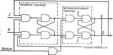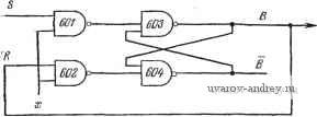 Рж. 6.4. Последовательное соединение /?5-триггеров. из двух входных сигналов и 5 первого iS-tpnrrepa) а его инверсия X объединена по схеме И с входными сигналами R-&S второго /?5-триггера. При введении обратных связей от В к и от В к S работа схемы остается корректной. При поступлении входного сигнала 5 на /?5-триггер 605 его выходной сигнал Q приобретает высокий уровень. Если В имеет низкий уровень, то он и остается низким, потому что д;=0. Когда х=\, значение Q лередается в /?5-триггер 606 и В приобретает высокий уровень. Несмотря на наличие обратной .связи от В к i?, нарушений в работе схемы не происходит, потому что х=0. При такой организации ?5-триггеров и обратных связей от В к R и от к S неопределенностей в работе схемы не возникает ни при каких передачах. Таким образом, применение этих триггеров в схеме позволяет снять ограничение, в соответствии с которым на каждом переходе может изменяться не более чем одна переменная состояния [3]. 6,3. РАБОТА Ж-ТРИГГЕРА Схема, изображенная на рис. 6.4, представлена в другом виде на рис. 6.5. Ее основные входы обозначены буквами J и К, чтобы подчеркнуть принципиальное отличие работы этого триггера от ?ч$-триггера. Входной сигнал х становится синхронизирующим. Введены обратные связи, охватывающие все устройство, так как предполагается, что оно должно работать именно при их наличии. Дополнительно введены входы S и С, чтобы ![]() сигна/т Рис. 6.5. Функциональная схема /iC-триггера. данный триггер мог выполнять функции обычного 7?5-триггера. Название вход сброса R заменено на вход очистки С , что больше соответствует стандартным названиям, принятым в промышленности, так как схема реагирует на сигналы низкого, нулевого уровня, поступающие на входы S и С, а не на сигналы высокого, единичного уровня. На рис. 6.6 приведено описание работы С-триггера [3, 12]. Рис. 6.6, а иллюстрирует функционирование С-триггера в виде таблицы входных сигналов. Исходное состояние и состояние перехода обозначены соответственно как q и Q. Таблица представляет собой вариант карты Карно, отличающийся от традиционного изображения тем, что в ней приведены значения сигналов 1 ... 9 10 11 12 13 14 15 ... 39 |