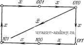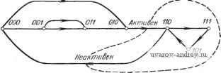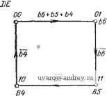 Рис. У.6.6. Схема управления уровнем и разрешением. по команде чтения информации с линий данных. Аналогично низкий уровень Ъ\ вызывает переход из состояния Л£С=001 в 011. Когда Cat принимает низкий уровень, происходит переход в состояние ЛВС= 111. При этом вырабатывается выходной сигнал ФЛАГ и по команде чтения информации с линий данных происходит автоматический возврат в состояние ЛВС=011. Решите эту задачу, пользуясь методом синтеза схем типа П. У.6.7. В интерфейсе, описанном в упражнении У.6.6, добавлен второй управляющий сигнал Са2, значение которого определяет наряду с управлением уровнем и разрешением управление вводом и выводом. Для этого предназначены биты 65, 64 и ЬЗ. Граф переходов схемы показан На рис. У.6.7. Это опять иллюстративный пример, который не представляет собой диаграммы состояний законченной или серийно выпускаемой схемы. Бит 65 служит для задания режима ввода или режима вывода (рис. У.6.7, а). Если задан режим ввода, то схема функционирует в соответствии с графом переходов, представленным на рис. У.6.7, 6. Этот граф очень £FB ![]() ООО Запись -ЬЗ 011 f Запись-ТЗОЮ