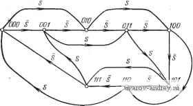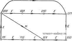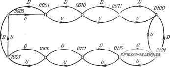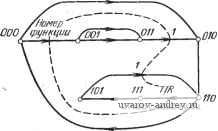 Управляющий регистр ган /ООО 8Б 101 о ![]() о 110 о Рис. 6.21. Составные схемы. а - исполнительная схема; б - рабочая схема интерфейса. Рис. 6.20 иллюстрирует упрощенный вариант щироко распространенного метода построения интерфейсов. В состоянии ОЖИДАНИЕ в управляющий регистр загружается управляющее слово Ь7 - ЬО. По команде начала работы происходит переход в состояние ABC=\OQ, и в устройство посылается сигнал прерывания. Оно отвечает сигналом Устройство готово, который вызывает переход в состояние ABC=\Q\. В зависимости от значения бита Ь7 интерфейс осуществляет теперь пересылку данных в разных направлениях. Переход ЛВС=001, 011 соответствует вводу, а переход ЛБС= 111, ПО, 010 - выводу информации. При переходе из ЛБС=110 в 010 бит 3 может быть использован для управления задержкой процесса передачи. Такие задержки могут использоваться для синхронизации функционирования аппаратных и программных средств. 6.12. СОСТАВНЫЕ СХЕМЫ В ходе предшествующих рассуждений, результатом которых явилось построение программируемого интерфейса, действие последовательностной схемы определялось комбинационной или декодирующей схемой. Естественным развитием этой идеи является задание действий последовательностной ведомой схемы последовательностной ведущей схемой. Это приводит к вложению последовательностных схем. Такой подход иллюстрируется диаграммой состояний, представленной на рис. 6.21. На рис. 6.21, с показана ведущая схема. Ее действия программируются таким же управляющим регистром, как и использованный выше. Эта схема рассматривается в данном случае как схема, управляемая событиями. Единичное значение любого из битов Ь6, Ь5 или Ь4 вызывает переход в состояние D£=01. Если два бита имеют единичные значения, то ведущая схема выбирает старший из них. Рабочая схема интерфейса, которая считается тактируемой, вынужденно реагирует по-разному на единичное значение каждого бита. Очевидно, простым развитием данной идеи, повышающим ее эффективность, является предоставление каждому из выходных сигналов В6, 85 и 84 отдельной рабочей схемы. 6.13. УПРАЖНЕНИЯ У.6.1. Спроектируйте реверсивный счетчик, граф переходов которого приведен ча рис. У.6.1 ([/ - сигнал увеличения, D - сигнал уменьшения), на /С-триггерах, пользуясь методом проектирования схем типа I. ![]() Рис. У.6.1. Реверсивный счетчик. У.6.2. Спроектируйте счетчик, граф переходов которого приведен на рис. У.6.2, пользуясь методом проектирования схем типа I. У.6.3. Спроектируйте счетчик, граф переходов которого приведен на рис. У.6.3, пользуясь методом проектирования типа I. ООО П 00! JL ою ![]() Рис. У.6.2. Счетчик с пропуском состояний. ![]() Рис. У.6.3. Счетчик с пропуском состояний. У.6.4. Спроектируйте счетчик, граф переходов которого приведен иа рис. У.6.4, пользуясь методом проектирования схем типа I. fiST ООО ![]() Рис. у.6.4. Счетчик с переходами через состояния. У.6.5. Спроектируйте счетчик, граф переходов которого приведен иа рис. У.6.5. Разделите задачу на части и нарисуйте схему (а), имеющую только один вход Е, и схему (б) с входами L и М. Для построения схемы (а) используйте метод синтеза схем I, а для построения схемы (б) -метод синтеза схем II. Объедините оба частных решения и получите полное решение задачи. У.6.6. Спроектирован интерфейс, позволяющий программно заставить один из управляющих сигналов (Cal) реагировать на переход к высокому или низкому уровню. Для этого используе
