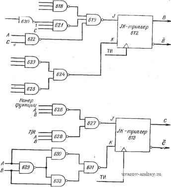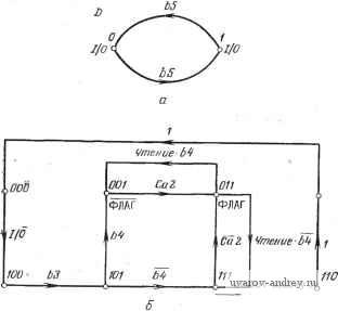 Рис. У.6.7. Программирование посредством управляющих бит. а - исполнительная схема; б - схема управления вводом, уровнем и разрешением; в - вывод, чтение!запись. напоминает граф, изображенный на рис. У.б.а В результате принятия решения о выполнении операции происходит переход из £FG=000 в 100 (сигнал 110 имеет низкий уровень). Работа схемы разрешается, когда бит 63 имеет высокий уровень. Высокий уровень бита 64 определяет изменение уровня сигнала ФЛАГ с низкого на высокий при наличии сигнала Са2 и сброс сигнала ФЛАГ под действием команды Чтение. Низкий уровень 64 при наличии сигнала Са2 также вызывает изменение уровня сигнала ФЛАГ с низкого иа высокий и сброс сигнала ФЛАГ при поступлении команды чтения данных. Если посредством бита 65 задан режим вывода, то выполняются действия, описываемые графом переходов, изображенным иа рис. У.6.7, е. Исполнительная схема вызывает переход из состояния Я С=000 в состояние 001. Если бит Ь4 имеет низкий уровень, то совместно с командой Чтение используется выходной сигнал СА2. По команде чтения данных СА2 принимает низкий уровень одновременно с переходом схемы в состояние Я С=100. Высокий уровень СА2 восстанавливается при высоком уровне СА1, если имеет высокий уровень ЬЗ или если при низком уровне 63 поступает сигнал разрешения выборки модуля. Аналогичным образом выходной сигнал СА2 используется с командой Запись, когда 64 имеет высокий уровень. Высокий уровень этого бита вызывает переход из состояния ЯЖ==001 в состояние 011. При переходе Н1К= =011 в 010 сигнал СА2 имеет такое же значение, как и бит 63. Будем считать, что исполнительная схема является схемой, управляемой событиями (входными сигналами), а схема управления - тактируемой схемой. /1В Режим г 10 Рвоким 1