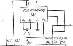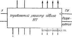 Рис. 9.4. Базовая схема регистра сдвига на JK триггерах. ВХОДНЫХ сигналов установки и сброса /?5-триггеров одной серией тактовых импульсов (ТИ). Соответствующая схема показана на рис. 9.3. Когда ТИ = 0, данные в регистре сохраняются. Но-, вые данные принимаются, когда ТИ=1. 9.2. РЕГИСТРЫ СДВИГА Регистр сдвига - устройство, в котором данные могут сдвигаться последовательно из триггера в триггер. На рис. 9.4 показано, как реализуется базовая операция сдвига на С-триг-герах. Входные данные вводятся в крайний слева триггер. С каждым тактовым импульсом они продвигаются на один триггер вправо. На рис. 9.5 приведено удобное логическое обозначение управляемого регистра сдвига, который поставляется в виде отдельной интегральной схемы. На рис. 9.6 показано, как реализован этот регистр на триггерах и мультиплексорах. Данные в регистр могут быть загружены по любому из двух входов: A=a%a2aiao или Bbsbzbibo. Имеются четыре режима управления, задаваемые управляющими входами X и У. При XY=Ol регистр функционирует как последовательный. Новые входные данные загружаются со стороны старшего разряда. При этом все остальные биты сдвигаются на одну позицию в Управляющие Входы у ВагоВше сигналь/ SLI SR1 Вь/а7о0нь/е сигналы Qj а, а, йа ![]() 3 Ьг Ь, bo Oj a а, а^ Ва:однь/е сигналы Рис. 9.5. Условное обозначение регистра сдвига. Ое в, SLI bo Cz йз uf bz h h h h Мультиплексор 318 / 4 h lo I, Мультиплексор 919 JK-mpueeep 920 Д JK-триггер 9Z1 Д JK-триггер 9ZZ JK-триггер згз Мультиплексор 9Z 4 h Ii lo Мультиплексор 9ZS I.i If lo У bj &o Ог Oj bj йг SRI as Разрешение Рис. 9.6. Типовой управляемый регистр сдвига на С-триггерах и мультиплексорах. сторону младших (вправо). При Х=10 регистр также работает как последовательный. Новые данные загружаются в этом случае через младший разряд регистра. При каждой загрузке все остальные разряды сдвигаются на одну позицию в сторону старших (влево). Информационными входами при последовательной работе являются SRI для сдвига вправо и SLI лля сдвига влево. Соединив RSI с Qo или SLI с Qs, можно построить схему кругового сдвига. При XY=00 в регистр загружается информация через входы А, а при Х= 11 - через входы В. Оба этих вида загрузки называются параллельными операциями. Функционирование управляемого регистра сдвига описывается в табл. 9.1.. 13-1272 9.3. ФОРМИРОВАНИЕ КОДОВ ПОСРЕДСТВОМ РЕГИСТРОВ СДВИГА Регистры сдвига находят весьма широкое применение. Одним !из примеров является их использование в схемах сопряжения .ЭВМ между собой или ЭВМ и периферийных устройств. Дан-,ные, подлежащие передаче, могут быть преобразованы из параллельной формы в последовательную; при этом достигаются хокращение числа линий связи, экономия кабеля и т. д. -Bbixod УпраВшемый регистр ТИ сдвига 9Z7 2 Ьг bf bo Розреииение Од а, о о Входы для параллельной загрузки Рис. 9.7. Генерация бита четности с помощью регистра сдвига. Управляемые регистры сдвига могут быть включены таким образом, чтобы генерировались дополнительные биты, служащие для обнаружения ошибок при передаче информации. Наглядным примером такого использования регистров сдвига является устройство формирова- Тиблица 9.1 Описание функционирования управляемого регистра сдвига Функция X Y О О Загрузка В регистр данных через вхоВы А Сдвиг влево Зогрузна В регистр Ванных через входы В Сдвиг вправо Старший разряд Сдвиг Влево Младший разряд ния бита четности (рис. 9.7), функционирующее следующим образом. Сначала на время од