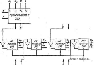 f 0 Q, Of 3 (\ Разрешение Рис. 9.13. Реализация типового многофункционального регистра. триггерах и мультиплексорах, представленная на рис. 9.13; имеет четыре режима управления, задаваемых сигналами X и У. Операция загрузки выполняется путем подачи данных а на входы /о всех мультиплексоров. Дополнение формируется при подаче на входы h инверсных значений переменных. Для выполнения сброса ко входам h всех мультиплексоров должны Таблциа 9.S Описание работы многофункционального регистра Управляющие входы ![]() Функция Загрузка в регистр данных по входным, линиям Формирование дополнения содержимого регистра Сброс регистра Установка регистра быть приложены сигналы с нулевыми значениями. Чтобы установить триггеры регистра в единичное состояние, следует подать единичные сигналы на входы /з всех мультиплексоров. Описание работы многофункционального регистра приведено в. табл. 9.5. 9.6. РЕГИСТРЫ ДЛЯ ДВОИЧНОГО СЧЕТА Функциональное обозначение регистра двоичного счета показано на рис. 9.14. Это устройство может принимать внешние данные, осуществлять счет в прямом й. обратном направлениях, а Управляющие Входы у двоичный, счетный регистр 82 < щ а, Рис. 9.14. Типовой двоичный счетный, регистр. также может быть сброшено в нулевое состояние. Его реализация на С-триггерах и мультиплексорах показана на рис. 9.15. Для выполнения операции сброса необходимо подать нулевые сигналы на входы /о всех мультиплексоров. Значения сигналов, подаваемых на входы h мультиплексоров для счета в прямом направлении, определяются методами, которые рассмотрены в гл. 6. При этом для согласования всех входов J и К требуется не тот набор простых вентилей, который показан на рис. 9.15, а специальная управляющая схема, обеспечивающая i LJL L ffJ! lo h h h Мультиплексор 93 h h h h Мультиплексор ![]()