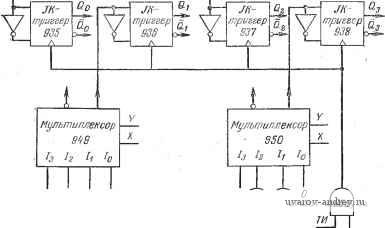 инверсии равен О, то дополняющая декодирующая схема выявляет в данных первую единицу, считая со стороны младшего разряда. В этом разряде выходного сигнала дополняющей декодирующей схемы и во всех последующих старших разрядах ВВод I I шВерсии Нулыли-Л плексор S53 \ I I о а. Мультиплексор 1о If h I3 Мултиплексор Iq и h h Мультиплексор 956 триггер 557 Л JH-триегвп 558 : Д JH- 1Л! триггер 353 JH-триегвр 960 A Мультиплексор 96 i I, /, I. ! Мультиплексор 963 Мультиплексор h h h to a, a, Cini Мультиплексор J Разрешение 0,1