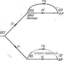 Регистр управления Рис. У.12.1. Граф переходов схемы ввода данных и информации о состоянии. На графе переходов (рис. У.12.1) использованы следзтощие сокращенные обозначения: а) для вводимой информации: rq--запрос на ввод, si - вводимые признаки состояния, dl - вводимые данные; б) для выводимой информации: RP - ответ на запрос, Л1(т)-бит 3 (бит задания режима работы), R - бит 6 (бит сброса устройства, т. е. перевода в состояние ожидания). У.12.3. Граф переходов на рис. У.12.3 представляет собой модификацию графа на рис. 6.16 и показывает только сигналы управления адаптером вво- ЛВмшнение ( директив VNAMEORG Запретить прерывания, адресуеные указателем стека sp Инициировать работу адаптера интерфейса Загрузить упраВляюиие сигналы в регистр адаптера: витЗ=М, Sum 6=0 Установить счетчик числа передач байтов данных Ожидать ответа (сигнала RP) Уменьшить содержимое счетчико но 1 ![]() Запросить загрузку Ванных Нет Установить бит В=1 Рис. У.12.2. Схема алгоритма работы интерфейса передачи данных и информации о состоянии. ООО 001 GO 010 ![]() Рис. У. 12.3. Граф переходов обобщенного интерфейса для микро-ЭВМ. да-вывода. Составьте подпрограмму, выполняющую следующие операции: а) инициирование выдачи двух выходных управляющих сигналов GO и CYCOM и ввод двух управляющих сигналов CYCLE и IDLE для двух портов А и В; б) управление портом Айв случае, когда биты второго, третьего и четвертого разрядов этого порта равны 1 (сигнал ATTENTION), выдача сигнала GO; в) чтение информации из порта В при поступлении сигнала CYCLE и выдача сигнала CYCOM; г) переход к шагу б при поступлении сигнала IDLE. У.12.4. Программа для связного интерфейса должна обеспечить передачу сообщения HAVE А GOOD DAY . Обеспечьте проверку передаваемых данных на нечетность, максимальное количество стоповых битов и минимальную скорость передачи данных. У.12.5. Напишите программу, обеспечивающую проверку связного интерфейса на ошибки в формате посылок и потерю символов. ГЛАВА 13 КОМПОНОВКА И ПУСК МИКРОПРОЦЕССОРНОЙ СИСТЕМЫ Базовый набор машинных команд микропроцессора приведен в гл. 11. Глава продолжается описанием техники разработки программ, основанной на использовании ОЗУ для имитации работы ПЗУ, и методов выполнения программ, находящихся в ОЗУ. Такое использование ОЗУ преследует цель создания виртуальной машины, имитирующей в ОЗУ работу ПЗУ. Эту систему удобно применять в качестве обучающей для ознакомления начинающего программиста с набором команд. При этом облегчается работа программиста. Проверку и модификацию программы легче проводить при ее размещении в ОЗУ, поскольку в этом случае корректировку текста программ и устранение ошибок можно выполнять с консоли микро-ЭВМ. Однако структура системы, предназначенная для разработки программ, плохо согласуется с требованиями к системе, ориентированной на обработку данных, по следующим причинам: 1. ОЗУ является не очень подходящей средой для размещения программ из-за его дороговизны, громоздкости и плохой надежности. 2. Система, предназначенная для разработки программ, использует разнообразные средства ввода-вывода, такие, как дисплей, которые могут и не требоваться в процессе обработки данных. Более подходящим может оказаться использование светового табло или других компактных устройств ввода-вывода, предназначенных для связи человека с микро-ЭВМ. 3. Универсальность не требуется, поскольку задачи разработ