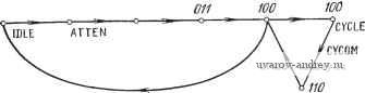 ТхЕ Рис. 12.10. Автоматическое включение синхронизирующих символов. При работе в синхронном режиме биты D1 D0=00 управляющего слова MODE INSTRUCTION задают синхронный режим передачи данных. Если указан этот режим, то бит D7 определяет количество синхронизирующих импульсов. Если D7=l, то используются одиночные синхронизирующие импульсы, если же D7=0 - сдвоенные. На рис. 12.10 показано включение синхронизирующих импульсов в выходной поток данных передатчика, выполняемое интерфейсом автоматически. Вывод, используемый для управляющего сигнала SYNDET (обнаружение синхросигнала), показан на рис. 12.9 в группе выводов сигналов управления приемом. При вводе используется сигнал SYNDET, поступающий извне, и символы данных считываются при поступлении следующего сигнала RxC. Сигнал SYNDET указывает появление последней группы синхроимпульсов при выполнении приема данных. Сигнал SYNDET сбрасывается при чтении ЦПУ информации о состоянии USART. Бит D6 задает источник синхронизации. Если D6=l, используется внешняя синхронизация, если D6=l-внутренняя. Назначение бит D5, D4, D3 и D2 со- ответствует описанию формата управляющего слова для асинхронного режима передачи (см. табл. К.4 приложения К). Формат содержимого регистра состояния. ЦПУ может в любой момент времени определить состояние USART, прочитав содержимое регистра состояния пары регистров управления/со- стояния. Формат содержимого этого регистра показан в табл. К.7 приложения К- Доступ к регистру осуществляется генерацией в USART сигнала RD при C/D=l. Бит D7 используется для определения наличия сигнала DSR, бит D6 - синхронизирующего символа (сигнала на выводе SYNDET). Последнее приводит к автоматическому сбросу синхронизирующего сигнала. Бит D5 указывает на ошибку в формате посылки, бит D4 - на потерю символа, бит D3 - на обнаружение ошибки при проверке на четность/нечетность. Бит D2 является признаком состояния вывода выходного сигнала управления передачей ТхЕ; бит D1-признаком состояния вывода выходного сигнала управления приемом RxR, а бит DO - признаком состояния вывода сигнала передатчик готов TxR. Щ 12.3. УПРАЖНЕНИЯ У.12.1. Световой индикатор с 7-сегментным дешифратором знаков описан в. упражнении У. 1.6. Составьте подпрограмму вывода повторяющейся последовательности чисел от О до 4, отображаемых указанными семью сегментами. Используйте стандартный интерфейс ввода-вывода. Обеспечьте задержку вывода каждой последовательности чисел приблизительно на 5 с. У.12.2. Упрощенный граф переходов устройства ввода, отражающий как ввод информации о состоянии, так и самих данных, показан на рис. У.12.1. На рис. У.12.2 приведена схема алгоритма пуска и работы устройства, проверки его состояния и ввода данных. ![]() Ввод информации о состоянии О