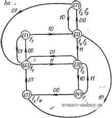 У.3.7. Таблица переходов для устройства, определяющего направление вращения, приведена на рис. У.3.5. Значение выходной функции в состояниях (1), (2), (3) и (4) должно быть равно О, а в состояниях (5), (6), (7) и (8) равно 1. Присвойте значения вторичным переменным и сформируйте логические выражения для Vi, Уг и f. ном виде.