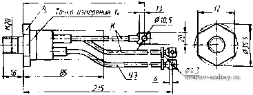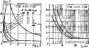 (dUx/dUxp. В/мкс в 0.025 0.05 0.075(dIoc/dtkn.А/мкс 0.2 0.4 ![]() 0.8 Юизс/Узсп Зависимоста скорости нарастания напряжения в закрытом состоянии от скорости нарастания тока в открытом состоянии Зависимости скорости нарастания напряжения в закрытом состоянии от постоянного напряжения в закрытом состоянии / Г(П-К). Т/вт Z г'п Ki. Т/Вт ![]() 1Q- 10 Зависимость переходного геплово-° сопротивления переход-корпус от времени Зависимость переходного теплового сопротивления переход-корпус от времени ТС161-100, ТС161-125, ТС161-160 Тиристоры кремниевые симметричные (симисторы) фузионные р-п-р-п-р. Предназначены для применения в систр мах и устройствах бесконтактной коммутации и регулиров^ ния электроэнергии, а также в цепях постоянного и перемен' ного токов частотой до 500 Гц преобразователей электроэнергии. Выпускаются в металлокерамическом корпус штыревой конструкции с гибкими силовыми выводами. Символическим анодом является основание. Обозначение типономинала приводится на корпусе. В I и II квадратах симисторы управляются положительными импульсами управления, в 1Н и IV квадрантах - отрицательными. Масса не более 298 г. KU1-WD. ТС161-160 ![]() Электрические параметры Импульсное напряжение в открытом состоянии при 4ги= 1.41/of Д МЛКГ. /ц - 10 мс, не более........................................... 1,45 В Пороговое напряжение при Гр = +110 С, не более......... .................................................. 0,95 В Отпирающее постоянное напряжение управления при Ц( = 12 В, не более: Го=-60Х, /у or = 0.8 А............................... 8.5 В Гп =-♦-25 X, от = 0,4 А............................... 5 В Гп = -1-И0Х,/,от = 0.25А........................... 3,5 В Неотпирающее постоянное напряжение управлений при t/jc и ~ 0,67[/jc п. /?у = 10 Ом, Гд = -H110 X, не менее..................... 0,3 В шийся импу/шсиьт ток л закрытом f:+110 Хне более....................................... 15 мА ТокyAet>- ;................;.......;............... 2 д Ток включения при Uc = 12 ВД - 2 А, , /eft =2 А/мкс, fy = 50 ммс, не более.............. 500 мА Отпирающий постоянный ток управления .................................... 0,8 А г =+25Х.................................................. 0,4 А Гп=+ЯОХ................................................. 0,25 А Неотпирающий постоянный ток управления приУзси = 0.67Узс п,/?7=100м. -+110 X, не менее........................................ 5 мА Время включения при У-к и = ЮО В, /ог и = GC,Af Kc. U = 1 А, tf,/tff = 1 А/мкс. = 50 мкс, не более........................................... 20 мкс Время задержки при Узе и ~ В, /ог и = /ог д МАКО и = f А, Cfl/dt= 1 А/мкс, = 50 мкс, не более........................................... 10 мкс Время обратного восстановления при U,f,p и = 100 В, /оси ~ ос Д МАКГ (С/ос/с/Осп = 1 А/мкс, fu = 0,5 мс, Гп = +110 X, не более........................................ 15 мкс Заряд обратного восстановления при Uob и = 100 В, и = ос Д МАКС. (dV/df)cn = 1 А/мкс, tn = 0,5 мс, 7п = +110Х,не6олее.................................... 50 мкКл Динамическое сопротивление в открытом состоянии при Гп = +1Ю X, не более: TCl6T-tQ0................................................... 3,9 мОм ТС161-125................................................... 3,1 мОм ТС161-160................................................... 2,4 мОм Тепловое сопротивление переход-корпус, не более............................................................. 0,2 Х/В Предельные эксплуатационные данные Повторяющееся импульсное напряжение закрытом состоянии........................................ 200-1200 В еловторяющееся импульсное напряжение закрытом состоянии........................................ Ь^Щc.п Рабочее импульсное напряжение в закрытом состоянии........................................................... 0>8хп Максимально допустимое постоянное им- ..j,...---------- ------.---------г.г...... -4-3q критическая скорость нарастания коммутационного напряжения при Узе и ~ зс, г?> /ос и = fac ДМАКС. fvi 5 мс, tf/oc/tff= 0,1 А/мкс, f/y и == 20 В, Гу HP = 1 мкс, Гу = 50 мкс, /?у = 5 Ом, = +110 X: груп