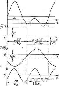 § 7.3. О сложных видах вынужденных колебаний Рис. 7.2. К определению условий су ществоваиия вынужденных колебаний. Сложные виды вынужденных колебаний, как и автоколебаний, характеризуются тем, что повторение их формы происходит в общем случае через s переключений, кроме того, период вынужденных колебаний может быть также кратен периоду внешнего воздействия. При наличии внешнего воздействия управляющий сигнал равен £(0 = Л/о(сйо;-ф)-2(0, где z{t) определяется выражениями, приведенными в § 5.5. Подставляя это значение x{t) в соотношения (5.64) и (5.64), получим условия существования вынужденных колебаний сложной формы в релейных системах без зоны нечувствительности. При нечетном числе переключений s внутри полупериода: 1) Условия надлежащих моментов переключений: () = о(я-ф)-2(1 (7.10) (y> = о (v. - Ф) - 5 (у, -Ко, х(у1) = Л/о (Y/я - Ф) - г (уг = (- 1) Ко. (y- 1) = (y.-i - ф) - г (y.-, = Ко; 2) условие надлежащих направлений переключений (после деления неравенств на соо): J л, СОо -) = лГ(я-ф)--1-()<о, 1 л Лfo(Y.я-ф)-g-(Y.)](-i)>0,
