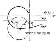 Рис. 8.3. Внешнее периодическое воздействие, его производная (а) и соответствующая им функция of (л-Ф) (б). И, следовательно, наибольшее число возможных значений ф не превышает четырех. Формулы (8.4), (8.5) остаются справедливыми и в этих, более сложных, случаях. Если внешнее воздействие гармоническое, то определение Лкр и ф существенно упрощается. Действительно, предположим, что ЦтШ f{t) = AfoM - (i>) = = Л81п(а)/ -ф). (8.11) Тогда fo (л - ф) = sin (я - ф), fo (St - ф) = cos (я - ф). Следовательно, функция 5(я-ф) будет равна (я - ф) = Л [COS (я - ф) + + / sin (я - ф)] = Ае (8.13) Отсюда заключаем, что 5(я - ф) соответствует окружности радиуса Л. Точки пересечения этой окружности с прямой -ко в левой полуплоскости / определяют возможное значение ф. Фазы Ф можно определять непосредственно из рисунка, не производя ![]() (8.12) Рис. 8.4. Определение фазы ф при внешнем гармоническом воздействии. разметки окружности. Для этого нужно из центра окружности (находящегося на кривой / в точке, соответствующей юо (точка О')) провести радиусы А к точкам пересечения ее с прямой -хоь расположенным в левой полуплоскости. Углы ф1 и ф2, образованные этими радиусами с прямой -яоь будут равны искомым значениям (рис. 8.4). Если о (точка О') находится ниже прямой -Хо, то ф1 и ф2 положительны, если же соо (точка О') находится выше прямой -Ко, то ф1 и фа отрицательны. Критические значения амплитуды внешнего воздействия Л„р определяются весьма просто. Если щ находится в левой полуплоскости, то Лцф определяется длиной перпендикуляра, опущенного из точки О'и соответствующей щ, на прямую -ко