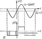 ![]() ![]() Если дополнительное воздействие имеет форму треугольника (табл. 12.1), то последнее выражение справедливо во всем диапазоне изменения -j- от -I до Полученные выше соотношения (12.10) или общая форма (12.8), очевидно, остаются справедливыми, если сигнал Х\ будет не постоянной, а переменной величиной, медленно изменяющейся по сравнению с ffl(co/) (рис. 12.2). В этом случае Чкр , / X, (О (12.11) Зависимость Уср от Хп для различных форм дополнительного воздействия А7д(а)0 XI it) при \xi{t)\< л или при малых значениях Уср it) . X, (t) (12.12) Таким образом, при наличии дополнительного периодического воздействия относительно высокой частоты по сравнению с входной величиной {управляющим сигналом) релейный элемент {вместе с фильтром) превращается в функциональный преобразователь. Закон преобразования опреде-1 ляется функцией, обратной к функ- ции дополнительного периодического воздействия. xit) Xn-AfJcjt) ![]()