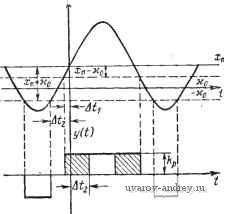 Рис. 12.2. к пояснению пропорциональной зависимости у^ от х it). ![]() Рис. 12.3. Опрелелсние зависимости у^ от прн ЩФО; Х=1. В частном случае при дополнительном воздействии треугольной формы релейный элемент превращается в линейный усилитель с коэффициентом усиления 2fepfef пА Коэффициент усиления такого линеаризованного релейного элемента обратно пропорционален амплитуде А внешнего периодического воздействия. Рассмотрим теперь релейный элемент с зоной нечувствительности. Для выходной величины этого релейного элемента, как видно из рис. 12.3, разность площадей равна 2/Sp(A,-fA/2). где Ai и Д<2 являются наименьшими (по абсолютной величине) корнями уравнений Л?д(сйД<,) = п-Ио. Л^д(сйД^2)=Хп + Хо> (12.13) соответственно. Отсюда находим, что I .-1 / а:о - Ир \ д, , I .-1(Хп + аЛ где fд' - функция, обратная к f Среднее значение г/ср в этом случае будет равно 2fep (Ml + As) 2я л ,-.() + ,;(i4-)]. (,2.14, Для того чтобы найти ср. нужно, как это следует из (12.14), сместить /д (-1 вдоль оси абсцисс на величины ±