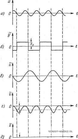 Рнс. 13.10. К формулировке критерия устойчивости в целом частотно-импульсной системы. Рис. 13.11. К формулировке критерия устойчивости в целом частотно-импульсной системы (при 9=0). или нейтральна, а преобразованная частотная характеристика линейной части Un(/co) лежит справа от прямой Попова для значений со, при которых (Ji{a) > О, и лежит слева от прямой Попова для значений со, при которых {Ji{m) < О (рис. 13.10) *). . В частном случае для И-частотно-импульсной модуляции Ki{jm) = - e-actgT, > (13,22) fi/cD -f I /rfcB + I Следовательно, -tg6,(co) = rico и f/,(co)>0. (13.23) При этом вместо двух условий (13.17) и (13.17) получаем одно условие: (/ ( ) +Г,соК„(со)+> О, (13.24) *) Критерий устойчивости в этой форме был установлен В. И. Д ы м к о-вым [1]. так как г = kiJT\. Действительная и мнимая части преобразованной характеристики (13.20) в этом случае равны Кп(сй) = Г,(0Ун(( ). J Частотно-импульсная автоматическая система будет устойчива в целом, если общая линейная часть устойчива или нейтральна, а преобразованная частотная характеристика линейной части 1п(/со) располагается справа от прямой Попова, проходящей через точку, (--, с наклоном -1 (рис. 13.11). Попытка применить этот частотный критерий устойчивости для обычной частотно-импульсной модуляции не приводит к конструктивным результатам. Действительно, в этом случае ii(/co) = = r. . (13.24) Следовательно, f/i( )) = 0, l/i((o) = -<0, (13.25) и значит, из условия (13.16) получаем F (ft)) = lmir (/a))>0. (13.26) Очевидно, что для реальных систем это условие не может быть выполнено, так как оно соответствует опережающим, нереализуемым устройствам. Причина такой ситуации состоит в том, что мы насильно в критерии устойчивости приняли = 0. Таким образом, для систем с частотно-импульсной модуляцией следует пользоваться общим критерием устойчивости, сформулированным в § 13.3 *). § 13.5. О периодических режимах В частотно-импульсных системах, как и в иных нелинейных системах, при невыполнении условий устойчивости в целом возможно возникновение автоколебаний. Эти автоколебания могут быть подавлены внешним периодическим воздействием, которое навязывает системе вынужденные колебания. Описанные в предыдущих главах методы исследования периодических режимов пригодны и для частотно-импульсных систем. Периодический *) См. А. X. Гелиг [6-8]. 7£ Рнс. 13.12. Сложный периодический режим. вежим В частотно-импульсных системах в общем случае соответствует сложному периодическому режиму, так как в полупериодах возможно различное число импульсов управляющего воздействия (рис. 13.12). Поэтому решение задачи о периодическом режиме с произвольным числом импульсов в полупериоде сводится к исследованию сложных видов периодических режимов. Лишь тогда, когда чи-ело импульсов в полупериоде равно единице, мы приходим к исследованию простейших видов периодических режимов. Эти же замечания можно сделать и по отношению к вынужденным колебаниям. При фактическом вычислении годографов частотно-импульсной автоматической системы, по которым определяются периодические режимы, следует учитывать специфику общей линейной части. Передаточная функция и частотная характеристика общей'линейной части определяются выражениями (13.5) и (13.9), причем, индекс всегда равен единице. Устойчивость возможных периодических режимов исследуется с помощью уравнений в вариациях, методика составления которых остается без существенных изменений. Мы не будем выписывать выражений г