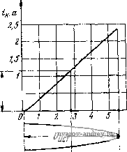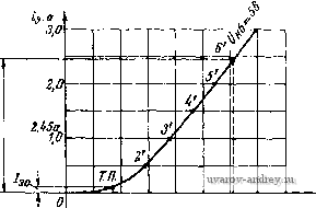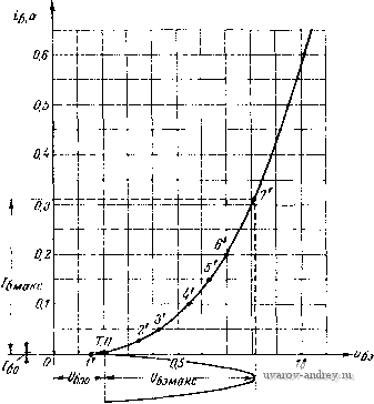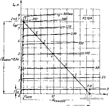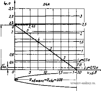 (3.39) Допустимую индуктивность рассеяния здесь также рассчитывать не нужно, так как ее действительное значение будет много меньше допустимого и частотные искажения на верхних частотах у выходного трансформатора практически отсутствуют. Требуемое напряжение источника питания Ек для каскада мощного усиления, работающего в режиме В, определяется выражением Ек = 7о + /0/-1П to, (3.40) так как произведение /oVj обычно много меньше, чем Lo. Источник питания каскада, работающего в режиме В (выпрямитель, сухая батарея, аккумулятор) должен иметь низкое выходное сопротивление; изменение напрял<ения источника питания при изменении входного сигнала от нуля до максимального расчетного значения не должно превышать 10-+15%. Пример 3,4. Рассчитаем каскад мощного усиления в режиме В с транзисторами, включенными с общей базой, имеющий- Рвых =20 ег,/? =180 ом, f =50 гц, /в=1в000 гц, М„<1,19, Кг<6%, Гокрмакс =+40°С Источник питания каска- да - выпрямитель с выходным напряжением 20 в и малым внутренним сопротивлением. Взяв кпд выходного трансформатора 0,85 для мощности 20 вт, получим р р вых 20 0,85 = 23,5 вт. Применим в каскаде транзисторы типа П4А, имеющие: максимальную мощность рассеивания с дополнительным внешним радиатором Ркмакс =20 вт, /кдоп =5 а, t/кб доп =60 в при / п 50°С; максимальное значение обратного тока коллектора /кнс =0,5 ма при 20°С, Рмнн = = 5 aj, =. =0,833 7 пдоп=90°С,/?тт=2Т/вт. Принципиальная схема рассчитываемого каскада приведена иа рис. 3.25. Задавшись максимальной температурой перехода в рабочих условиях /пмакс найдем допустимое напряжение питания выходной цепи або<0,4/кбдоп 1-0,08 70-50 ч = 0,4 . 60(1-0,08 . 2) =20,16 в, ![]() Рис. 3.25. Принципиальная схема каскада, к примеру 3.4 так как допустимое напряжение для транзисторов П4 должно снижаться на 8% на каждые 10°С повышения температуры перехода сверх 50°С. Таким образом, заданное напряжение выпрямителя, равное 20 е, является допустимым. Найдем сопротивление нагрузки для одного плеча выходной цепи, пренебрегая падением напряжения от тока покоя на первичной обмотке трансформатора к~П так как t/ост =0 для включения с общей базой. Максимальная амплитуда тока сигнала в цепи коллектора .* к макс - кбО /?к~П 20 8,5 = 2,35 а, что для П4А допустимо. На семействе выходных статических характеристик П4А, включенного с общей базой, строим нагрузочную прямую одного плеча двухтакт- ной схемы для Rk-П =8,5 ом, f/кбо =20 в (рис. 3.26). Отдаваемая каскадом мощность равна = 0,5Лк ,ке /?к~п =0,5 2,352 8,5 = 23,52 вт, ![]() Рис. 3.26. Выходные характеристики транзистора П4А, включенного с общей базой, к примеру 3.4 что достаточно. Возьмем ток пок.Я цепи коллектора У'ко = 0,05/кмакс = 0,05 2,35;=:0,12а ./зо для этого значения /эО на входной статической характеристике, находим U эбо= =0,17 в. Перенеся верхнюк> точку (точку 6) нагрузочной прямой на входную характеристику, найдем амплитуду напряжения входного сигнала иа транзисторе иэб макс =0,44 в (рис. 327). Предположим, по расчет инверсного каскада дал значения /?вых оэ1 =300 ол. г, = 10 ом, Пп = ного каскада составит = 0,08, тогда сопротивление источника сигнала для оконеч- /? ст ~ (/?выхоэ, ={300+10)0,0822 OJi. Для этого значения Лист рассчитываем данные для ряда точек сквозной характеристики (табл. 3.3) и строим эту характеристику (рис. 3.28), откуда находим дяя половины амплитуды эдс /i = l,15 а. ![]() эманс Рис. 3 27. В.ходная характеристика транзистора П4.\, включенного с общей базой, к примеру 3 4 ![]() Рис. 3.28. Сквозная динамическая характери