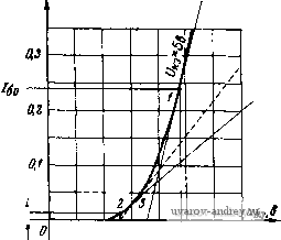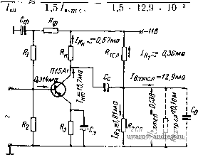 (4.8) Расчет коэффициента частотных искажений каскада на верх-гей рабочей частоте /в производят по формуле Mb=J. yi + {6,28/вСоАэкв) (4.9) Полагая нагружающую каскад емкость Cq равной: Cg СвыЧ оэ Ь Сэдст . (4.10) Значения Свыхоэ и С эдс. находят по ф-лам (1.5) и (1.7), одна-со o6fj4Ho Сьыхоэ с С^д с1 И МОЖНО считзть Со Сэдсл . Значение I экв представляет собой параллельное соединение /?выхтр и Rk ; эднако в обычных случаях /выхтр^к^ и можно считать экв ~ R к,-,. Пример 4.1. Рассчитаем транзисторный реостатный каскад предварительного усиления для однотактного каскада мощного усиления примера 3 I со следующи-,1И данными f 90 гц, f = 5000 гц, Л1 с1,06, М„э 1,12, М^ 1,26, Гокр макс =-f 30°С, Г окр. мни =--10°С, напрялсенне питания каскада £к = Не, коэффициент усиления желательно иметь наибольшим Каскад доджей нормально заботать при установке в него любого исправного экземпляра трапзнсгора выбранного тина. Данные каскада мощного усиления и использованного в нем транзистора П202 таковы /вхт<л =12,9 ла, (Уп\ m 1л =0,13 в, Тр 11 =10, ом. К,я = ==73,3, /грминоб =200 кгц. Ск м^кс =500 пф, Яа бс-, -=0,288 ом, /?1с, -360 ом, Rici =68 ом Так как каскад должен быть рассчитан на установку в него любого экземпляра транзистора, применим эмиттерную схему стабилизации режима, дтя развязки и дополнительного сглаживания пульсации источника ннташ! в цепь делителя включаем развязывающий фильтр Сф /?ф . Схечд рассчитываемого каскада изображена на рнс 4.2 Найдем значение /кш , просуммировав токи сигнала, (текущие через сопротивтенне /?в\Трсл , гсл, R[ci, Rk кт - 1 III \ 111 \ I fi -вхтсл \ I -ттсл \ I в\тсл Ргсл I \ Ri l.t I \ Rkop .....- . 1 с; 7 ,j 68 360 288 = И,9.10-.+ Л1 ,JW +413 , 5.7.а, где ориентировочное значение R находим, положив падение напряжении на нем равным 0,4 Ек : Rk op 0,4/:; ![]() = 228 ом. Рис. 4 2 Схема реостатного каскада к примеру 4 1 Таким образом, минимальный ток покоя коллектора [ранзистора реостатного каскада составит /ко=(1,05ч-1,2)/кт=1,1 15,7 17л< . Выбираем для каскада транзистор Г115Л, для которого: /комакс=20.а,р„ -50(а„ = 0,98),р„ ,= 100(%, ,=0,99), t/кэдо.,-15й. /г = 2 Л1гч, /к„с^10 .яла, Ртт~-0,2°С/мвт, С50 пф. По граничной частоте транзистор П1.5А подходит, так как /.рмп„ б = 2 Л4гч> 3/ \р = 3 5000 75=1,13Жгг^. Найдем Rk и /?э взяв падение паггряжения па них равш.гми 0,4 Е^ н 0,2 Ек соответственно: Rk = о,2£;- 0,4 17 . 10~ 11 7 10- = 259 ом (стапд. 270 ом), \29 ом (етанд. 130 ом). 10-3 .270-17 -10-3 . 130 = 4,2 в. Для UhM =4,2 в и /кО =17ла по статическим выходным и входной характеристикам П15А находим (УбэО =0,24 в, /?вхо= =258 ом (рис. 4.3, точка /). Взяв ггадение напряжения па Rф равпьгм 1,5 в, получим напряжение, подводимое к долителю смещения Е'к = 11 - 1,5 = 9,5 в, кото1)ое и используем для расчетгг Rt и /кОмсс . Максимальную температуру коллекторного перехода считаем равной R. При ЭТО' t/к эо = £к-/кО/?к--/кО Рэ = И - 17 = Гокрмакс -I- /ко t/k,oPxx =+30+17- IQ- 4,2 0,2 10-45°С Задавшись значением Л2 = 6/?вмоэ =--1356 ом (станд. 1300 ом) и найдя по )-лам (1.16) и (1.17) t/бэОмакс =0,262в, f бэОмип =0.185 в,/кн маю =Ъ6Амка, эпределим, что /?i = 2960 ом (станд. 3000 ом). Расчет /кО макс и Ukm мип дает значения 19,5 ма н 3,2 в, что допустимо. ![]() Рис. 4.3. Входная характеристика транзисторов П13-П15А, включенных с общим эмиттером, к примерам 4.1, 4.2 и 4.3 Сопротивление нагрузки цени коллектора неременному току равно RkRka слРях Трсл /?к~ -- /?к/?делсл t /к^пхТрсл дел слвх Трсл 270 . 57,1 10.1 где 270 57,1+270 10,1+57,1 10,1 R1R2 68 360 8,31 ом. дел сл = 57,1 ОМ. .делсл ,+2 68 + 360 Амплитуда входного тока сигнала и коэффициент усиления каскада составят; Дх т hm 6т 15,7 50 12,9 = 0,314 ма, = 41. 1бт 0,314 Амплитуда напряжения входного сигнала и коэффициент усиления нап