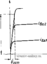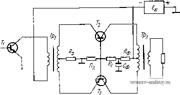 айдем значения: /1т=14,29ла, /2 =2,55л(а, /зт = - 0.29 жа, /4=-0,14ла, /ср =11,89 MCL Коэффициент гармоник каскада рассчитываем, положив коэффициент асимметрии 6 = 0,06 V(Ы2,nV + In+{ЫшУ V(0.06 2.55)2+(-0,29)2 + [0,06(-0,14)? о,023 = 2,3% что по условию допустимо. Из рис 3.19 найдем, что уточненное значение напряжения питания коллектор-база и'кбо , соответствующее уточненному току покоя /кО =9,2 ма, состав-ч1яет 8,3 е, тогда /ко(1+Ц 9,2(1+20) д^ Рмин -0 и Us60 = 0,225 в. Talc как выходной трансформатор должен обеспечить сопротивление нагрузки цепи коллекторов 2Rk.-- =2X420=840 ом, необходимый коэффициент трансформации составит = VSt = V 0.73.2. 420 = 2 - Взяв значение с=0,6, так как в первичной обмотке трансформатора имеется значительная постоянная составляющая тока, найдем сопротивление обмоток: i = r2-<~(l-T)=T 420(1-0,73) =85,2 олг, /1-7]. I /1-0,73\ 1 + C \ Необходимая индуктивность первичной обмотки трансформатора составит 0,159(2/?k--/-i) 0,159(840-85,2) fnl/MT-l 80 У 1,122-1 Задавшись падением напряжения на Rs , равным Еэ =0,1 f/кбо =0,83 в, найдем величину Ra , учитывая, что через него течет удвоенное значение тока покоя эмиттера; D Еа 0,83 , = W Ж7 = 2 9,2 . 10-3 (стандартное значение 43 ом, см. приложение 6). В рассчитываемом каскаде делитель смещения не шунтирует входную цепь; поэтому для улучшения стабилизации его сопротивление можно взять небольшим, исходя из допустимого расхода мощности на делитель Для получения эбо =0,225 в падение напряжения на сопротивлении R2 должно быть равно Е2Еа + f/эбо =0,83 + 0,225= 1,055 в. Задавшись током через R2, равным 0,3 1а ср , найдем ~ ОЖо ОЖГ ~ 0,3 . 9,2 . 10-3 -2 -(стаидартное сопротивление 360 ом). Схему стабилизации рассчитаем на изменение температуры н заданном диапазоне н смену транзисторов; определим максимальное и мнннмальное напря-я<ення смещения н максимальное значение начального тока коллектора: Цэбо макс = f/эбо + 0,0022(20- Гп ми ) = 0,225 + 0,0022 (20 - 5) = 0,258 в, f/збомин = /эбо-0,0022(Гпмакс-20)=0,225-0,0022(60-20)=0,137б, Гд макс-Тс 60-20 /кнмакс -/кнс -2 ° =10 2 =160 мка, потагая повышение температуры перехода на 30°С относительно Токриако. т е Г Пмакс =30°+30°=60°С. Найдем Ri, учитывая, что делитель является общим для двух транзисторов и полагая напряжение источника питания £к ж кбо + Е, + /ко =8,3+1,055 + 9,2 10 :10 в. Включив в цепь делителя цепочку фильтра Сф/?ф, как и в примере 3 2, и положив падение напряжения на Рф равным 1 в, получим напряжение на делителе Е'к =Ек -Еф= 0-1=9 в, которое подставим в формулы для Ri и /кО макс 1 + Рми {Е'к - f/эбомакс) /?э 2/ко мин (;?э+ /?2)2/к0мин- (2/кО мин/?2 эбО макс) 1+20 (9-0,258)-43 2 9,2 . 10 (43 + 360) 2-9,2.10-3 (2.9,2-10-3-360-0,258) (стандартное сопротивление 1800 ом). Максимальное значение тока покоя коллекторов составит = 1990ол1 кОмакс= 1 + Р. [£к^2-/эбО мин(/?1 + /?2] + /кнмакс1/?э(/?1 + /?2) R1R2] /?э(/?1 + /?2) + RlR2 1 + а. 40 1+40 [9-360-0,137(1800+360)]+! 60-10-б[43 (1800 + 360) +1800-360] 43 800 60)-Ь = 28 ма. При этом мощность, выделяющаяся в одном транзисторе при отсутствии сигнала, будет равна Р = Рк -)- Рэ = /кО макс /кбО+/бО макс ЛбО мин=/ко макс f/кбО + + Jflu, ИН = 14 - 10-3 . 8,3+ j, . 0,137=0,116 вт. Рмакс что допустимо. Повышение температуры перехода прн этом составит д7п-Р/?тт =0,116 . 0,2 . 103 = 0,0232 103 = 23,2°С, что даже немного меньше, чем предположенное повышение температуры перехода на 30°С; поэтому максимальный ток коллектора и выделяемая в транзисторе мощность будут меньше найденных. Требуемое напряжение источника питания каскада должно быть равно £к = UkQO + /кОмакс -+(2/э0макс Яэ + £эбо) = 2(/ко макс /кн макс) (1 ЬЗмакс ) г> j гг -5- Hs+LJsm Рмакс 2 - °- ° -><+- .36-Ю,225 = 10,14 е. 3.5. Расчет двухтактного каскада мощного усиления в режиме В В режиме В плечи двух